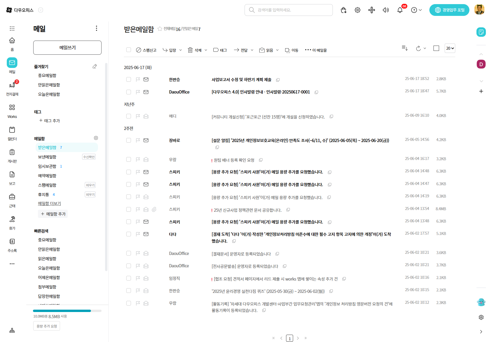 다우오피스 그룹웨어에서 제공하는 메일 기능은 기본적인 메일 커뮤니케이션 외에도 공유와 협업에 적합한 다양한 기능을 갖추고 있습니다.