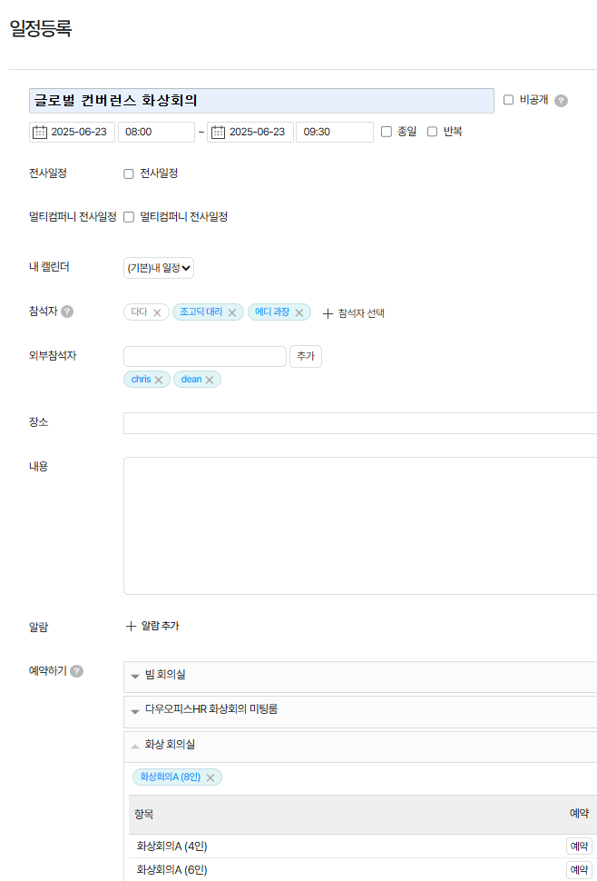 - 캘린더와 연동된 자산 카테고리의 경우, 사용자가 각자의 캘린더에서 일정 등록 시 바로 자산 예약이 가능합니다.