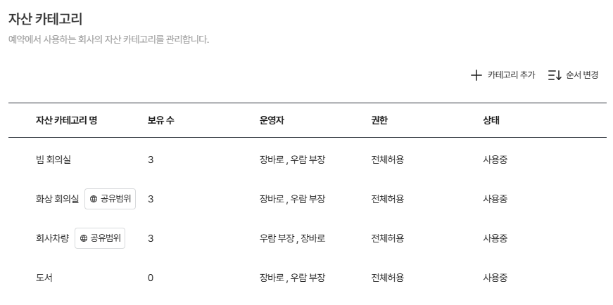 - 회사의 자산을 종류별로 묶는 자산 카테고리를 신규로 등록할 수 있으며, 카테고리 별 예약/대여 환경 및 이용 권한을 설정할 수 있습니다.