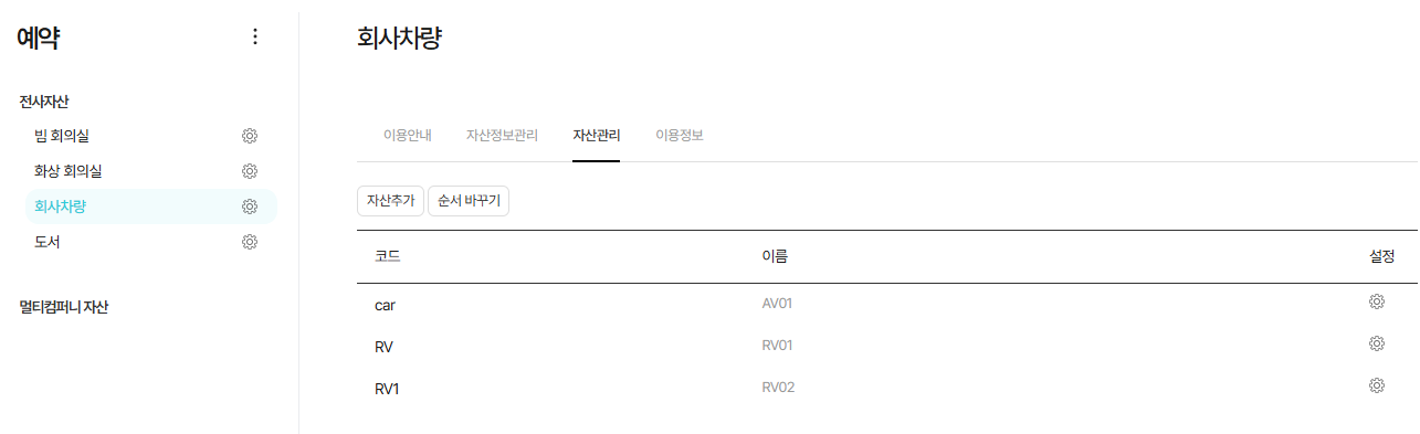 자산이란 실제로 예약하거나 사용할 수 있는 개별 자산 항목을 뜻합니다. 예) 3층 A회의실, 빔프로젝터 5번, 회사차랑 0000 등