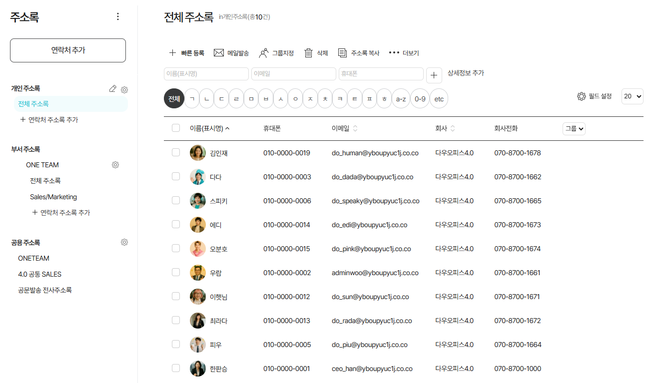 연락처의 성격에 따라 개인 주소록, 부서 주소록, 공용 주소록으로 구분하여 관리할 수 있습니다. ☎️