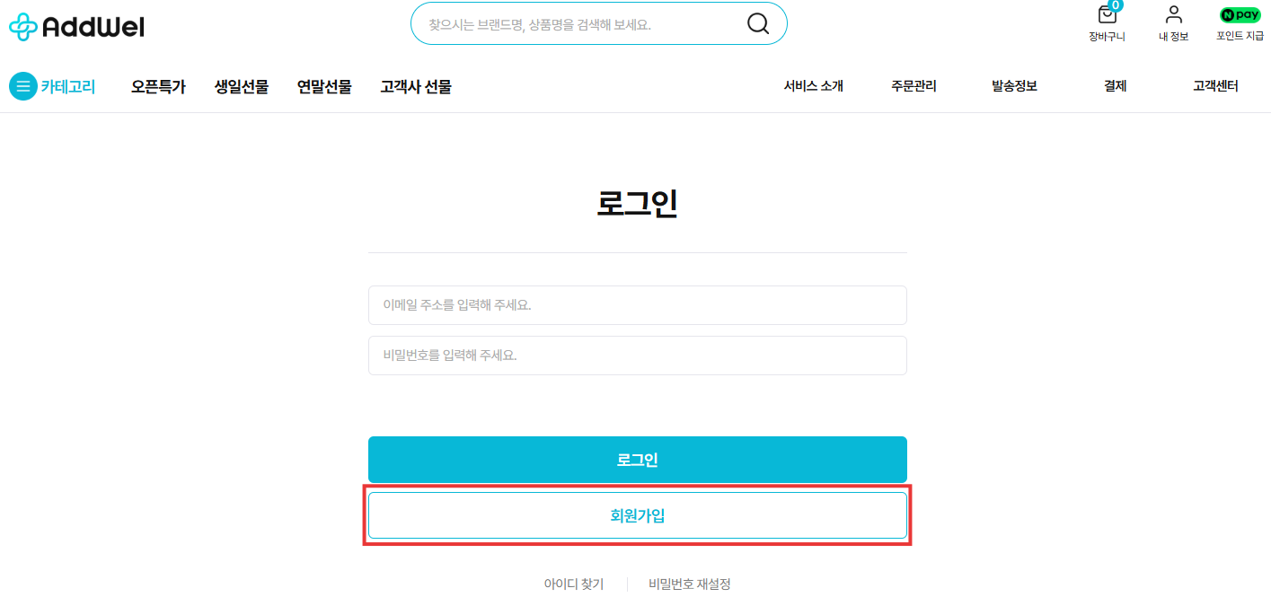 - 애드웰 메인 페이지 우측 상단 [로그인] 클릭 > [회원가입] 클릭