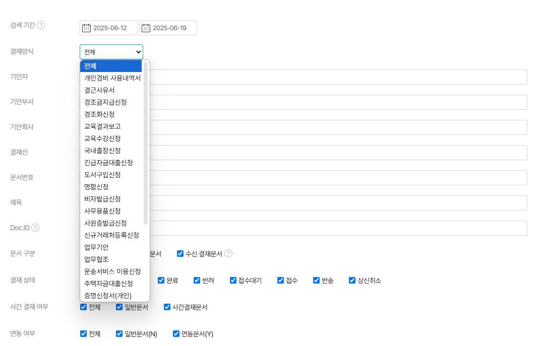 검색 필터를 이용해 문서번호, 결재양식, 결재 상태, 연동 여부 등을 통해 특정 기간 동안 문서를 검색하여, 진행 상태를 확인 또는 특정 기안자의 결재 문서를 빠르게 찾을 수 있습니다.