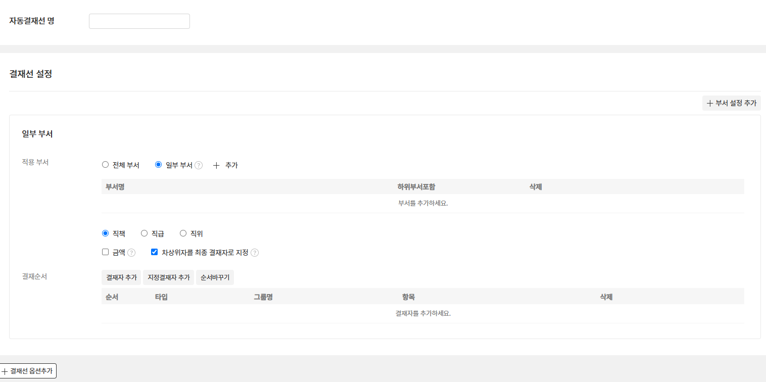- 일부 부서: 특정 부서에만 자동 결재선 적용 (해당 부서를 제외한 다른 부서에는 적용되지 않음)