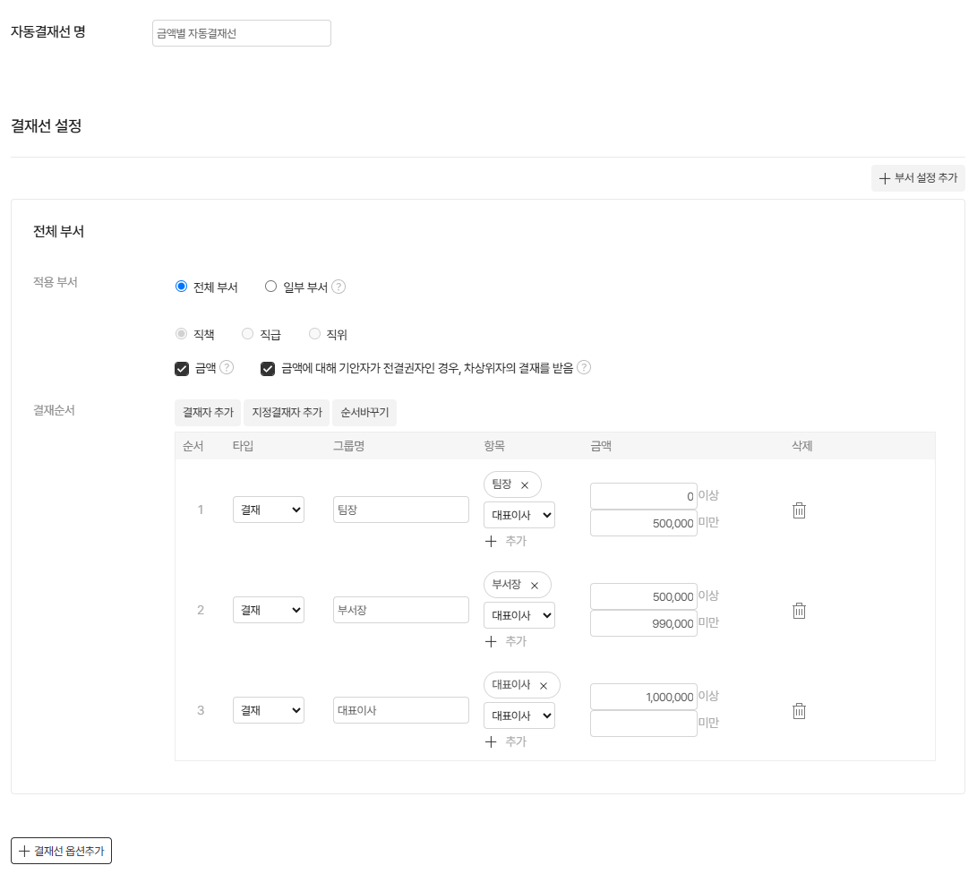 - 설정한 금액 구간에 따라 결재자가 자동 지정