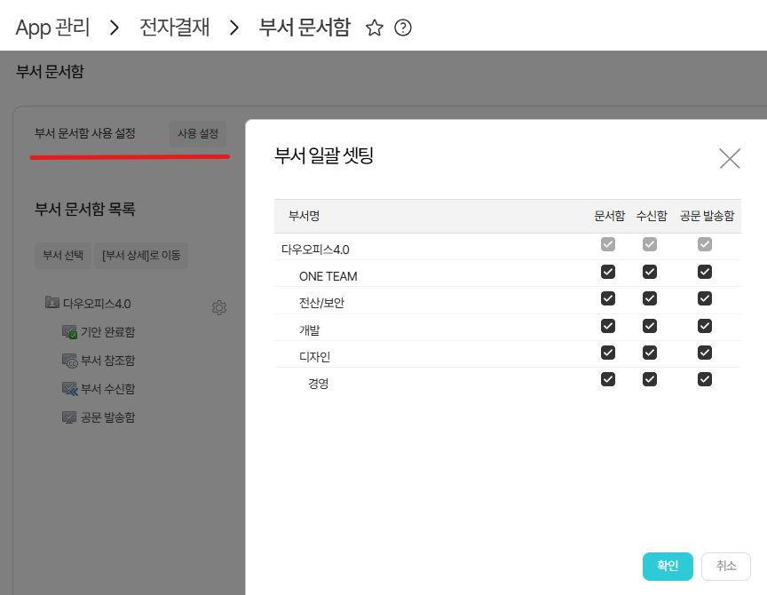 부서별로 문서함, 수신함, 공문 발송함 기능 사용 여부를 일괄 설정할 수 있습니다.