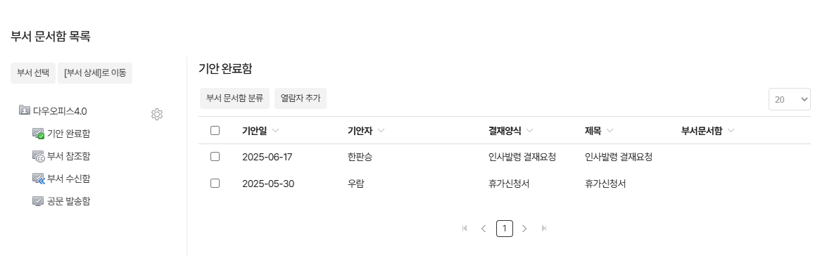- 부서수신함 : 부서에서 수신한 완료된 문서만 조회 가능