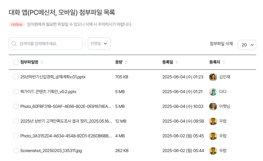 🧭 통합설정⚙️ > 데이터 관리 > 업로드 데이터 관리 > 대화 앱(PC메신저, 모바일) 첨부파일 목록에서 불필요한 첨부파일을 선택 후 [첨부파일 삭제] 버튼을 클릭하면 용량을 늘릴 수 있습니다.