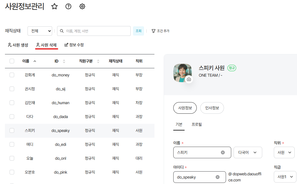 - 사원 정보는 자정 이후에 업데이트 되므로 [사원 삭제]를 눌렀더라도 용량이 곧바로 줄어들지 않습니다.
