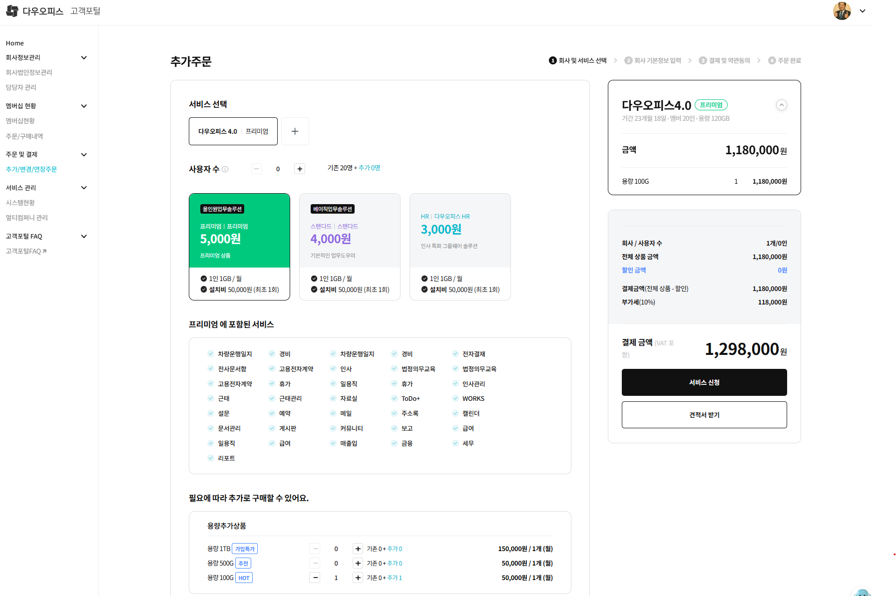 - 왼쪽 사이드 바 주문 및 결제 > 추가/변경/연장 주문