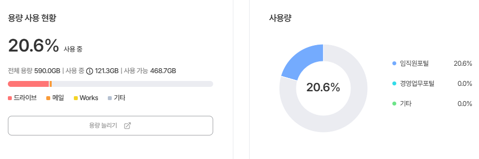 서비스 용량이 부족한 경우, 관리자는 [용량 늘리기] 버튼을 통해 추가 용량을 구매할 수 있습니다.