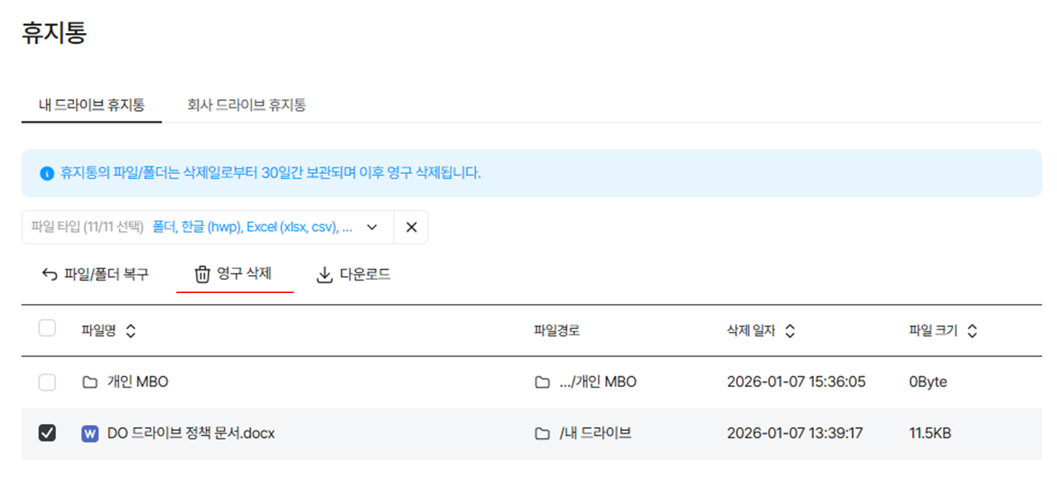 🧭 임직원포털 > 드라이브 > 회사 드라이브에서 불필요한 파일이나 중복 자료 삭제하거나 휴지통에 남아 있는 파일을 확인 후 영구 삭제하면 용량을 늘릴 수 있습니다.