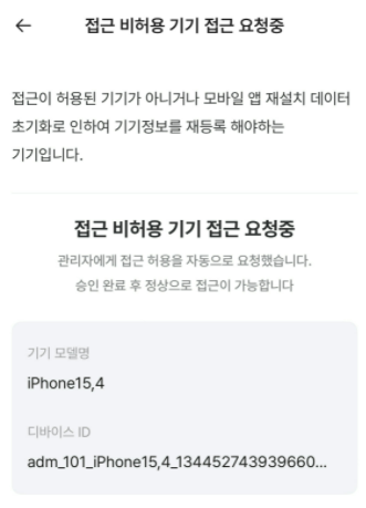 - 미등록된 기기에서 로그인 시, 자동으로 디바이스 ID가 발급되어 접근 요청 목록에 등록됨