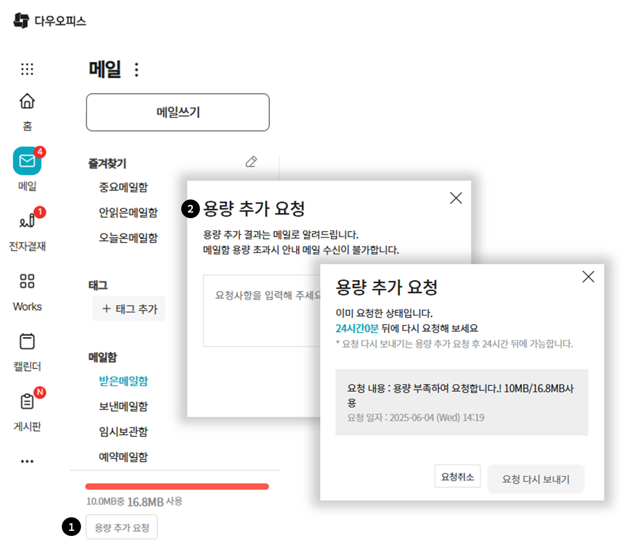 • 메일 : 메일 App > 메일함 알림 배너 또는 사용 용량에서 [용량 추가 요청] 선택