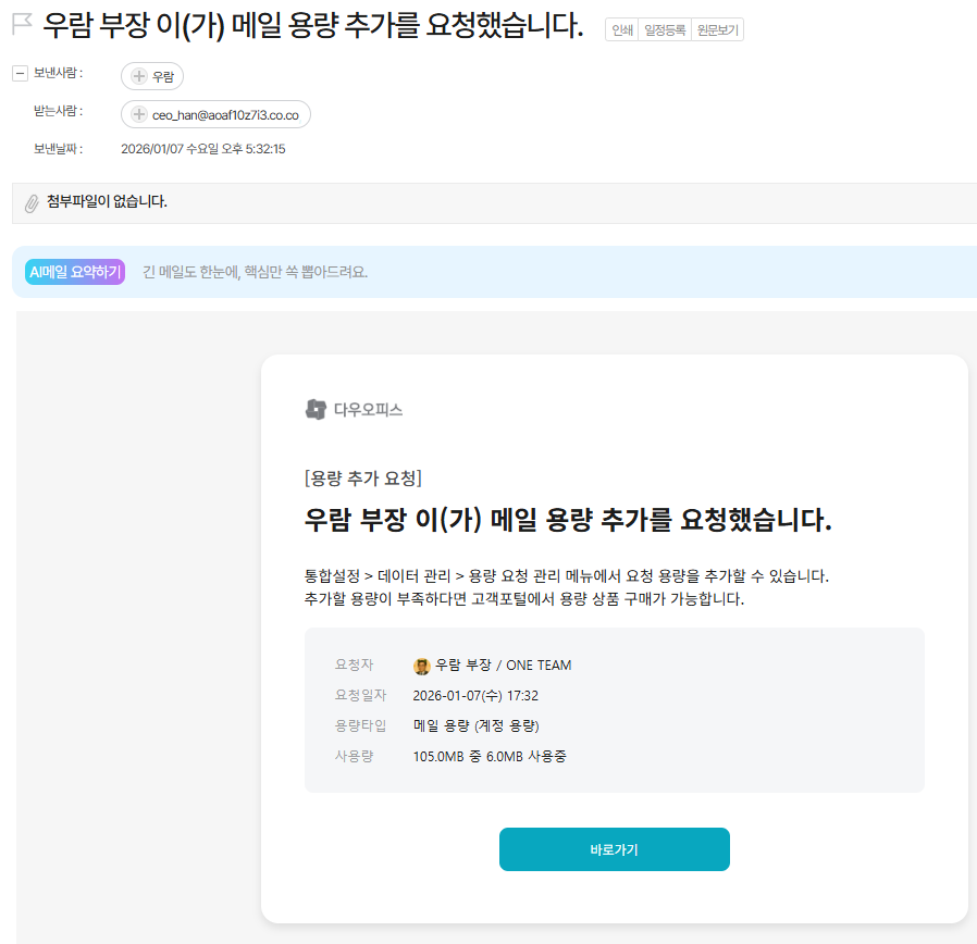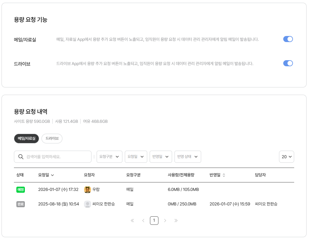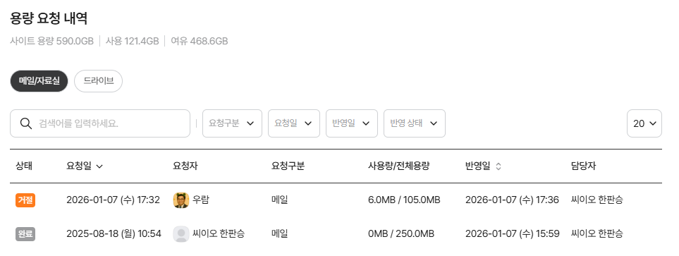 • 메일의 [바로가기] 버튼 또는 🧭통합설정⚙️ > 데이터 관리 > 용량 관리 > 용량 요청 관리 > [용량 요청 내역] 에서 직접 요청 사항 확인