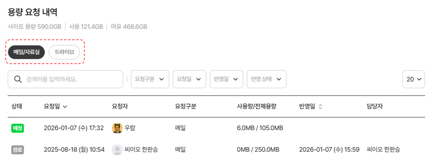 • [용량 요청 내역]은 메일/자료실 탭과 드라이브 탭에서 각 확인 가능