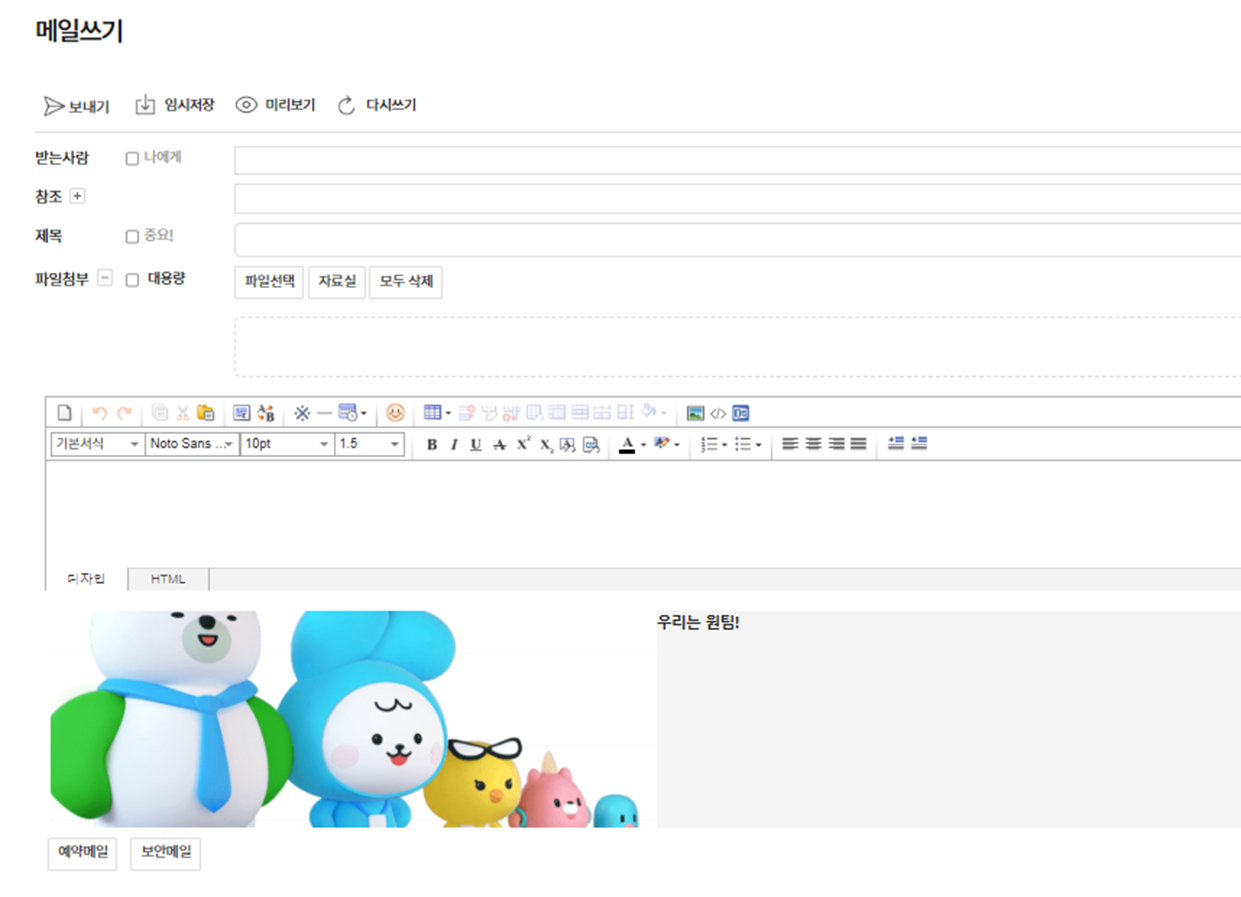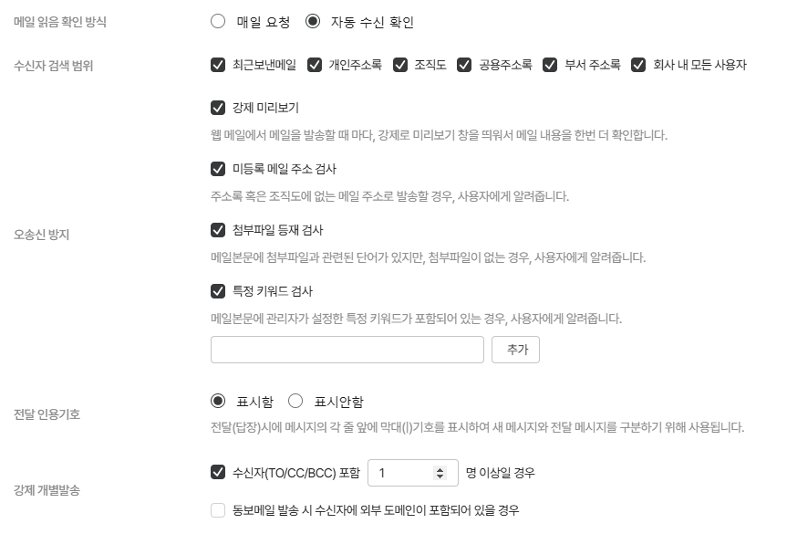 이 기능을 통해 조직의 메일 보안성을 강화하고, 메일 업무 중 발생할 수 있는 실수를 최소화할 수 있습니다.