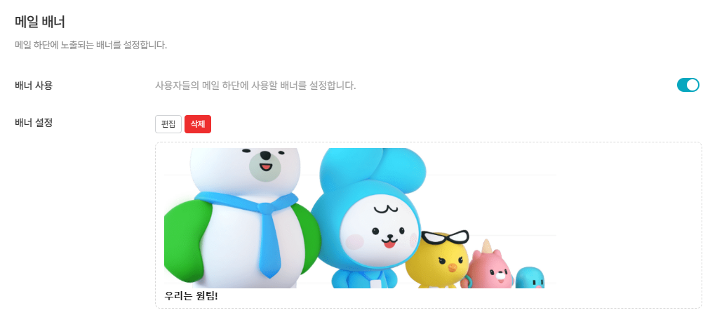 🧭통합설정⚙️ > 앱 관리 > 임직원 포털 > 메일 > [메일 배너]는 조직 전체 이메일 하단에 공통적으로 적용되는 메시지 블록으로, 기업의 브랜드 홍보, 보안 안내, 프로모션, 법적 고지 등의 정보를 일괄 삽입할 수 있도록 지원하는 기능입니다.