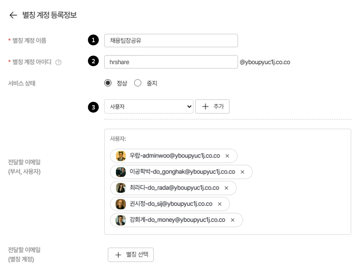 - 별칭 계정 아이디의 의미를 이해하는 이름 입력 (예: 채용팀, 영업팀 등)