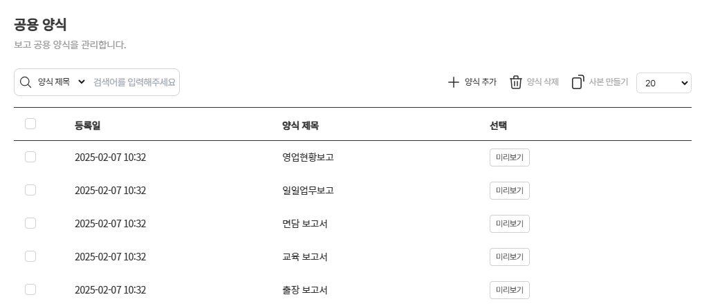 - 전 조직이 사용할 수 있는 공용 보고 양식 관리 가능