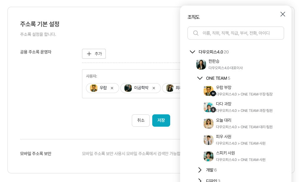 - 공용 주소록 운영자 : [+추가] 버튼 클릭 시 조직도가 노출되며 운영자 선택하여 공용 주소록 운영자 설정 후 저장