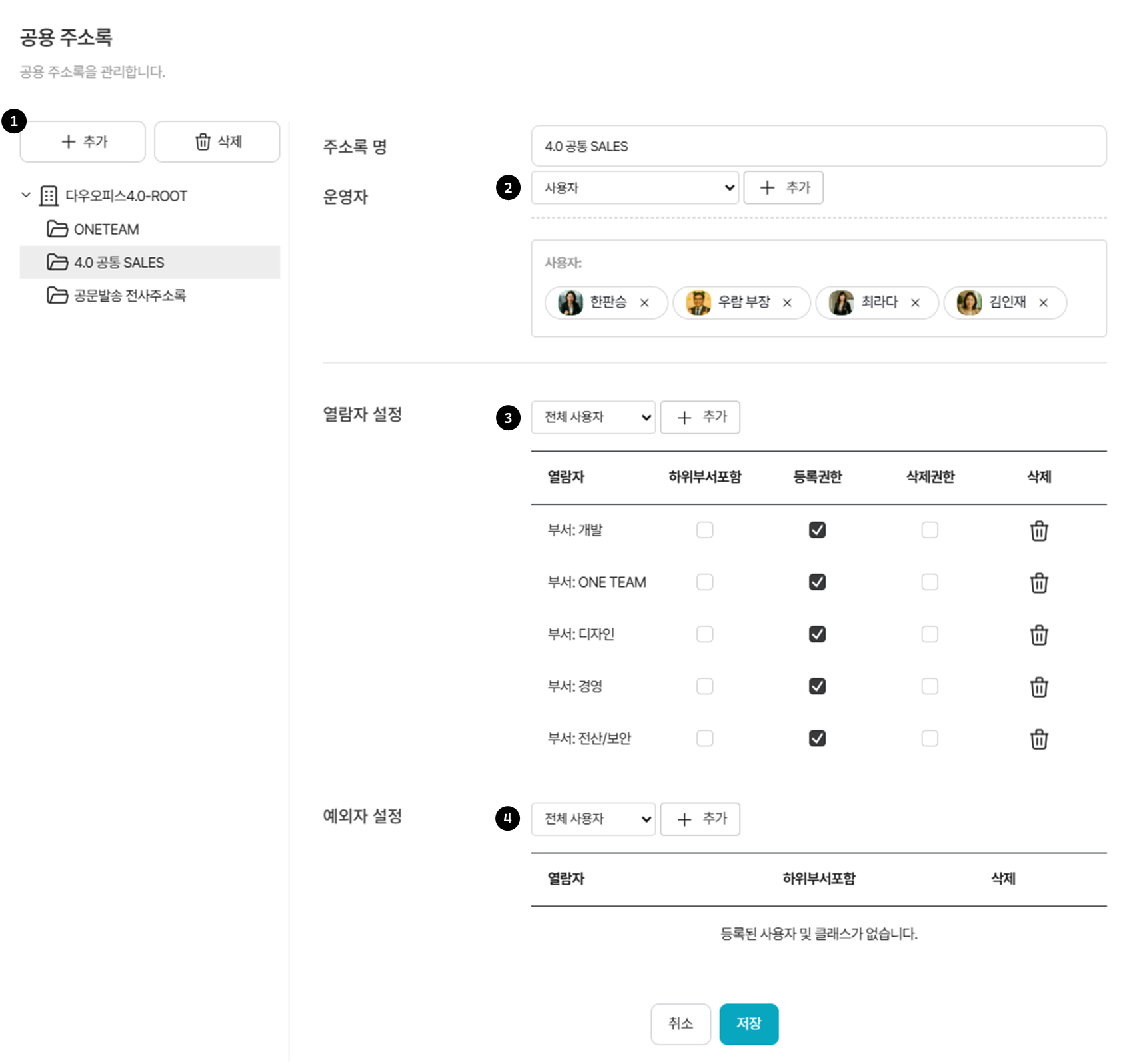 공용 주소록 추가시 주소록 별로 운영자를 지정하고, 열람자 및 예외자를 설정하여 공개 범위를 지정할 수 있습니다.