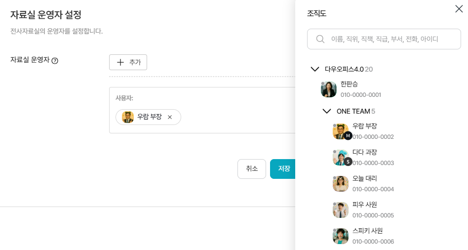 [+추가] 버튼을 클릭하여 전사 자료실을 운영할 수 있는 운영자를 지정할 수 있습니다.