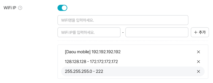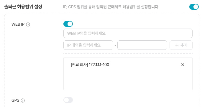 WEP IP, GPS 범위 외에 WiFi IP로도 출퇴근 허용범위를 설정할 수 있습니다. 해당 기능을 사용하면 설정한 설정한 WiFi IP를 통해서만 근태체크가 가능합니다.