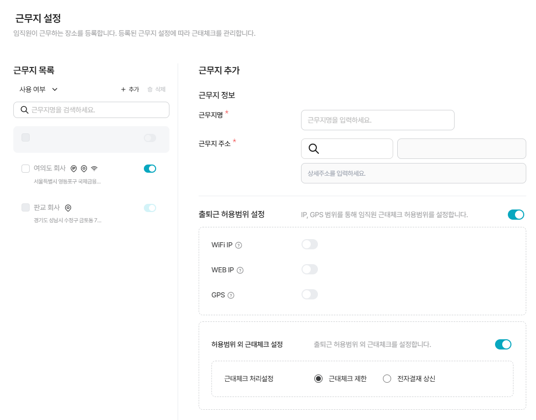 허용범위를 벗어난 장소에서는 근태체크가 제한되거나, 별도 승인 절차가 적용될 수 있습니다.
