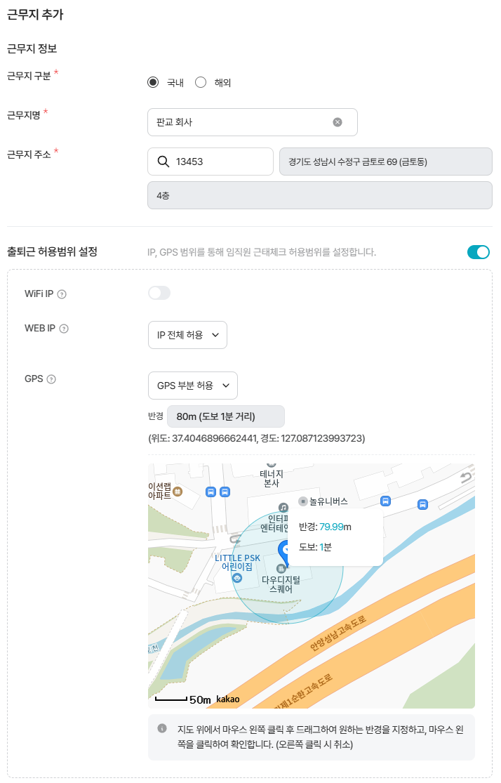 GPS : 근무지 주소 기준, GPS 반경 내에서만 근태 체크 가능