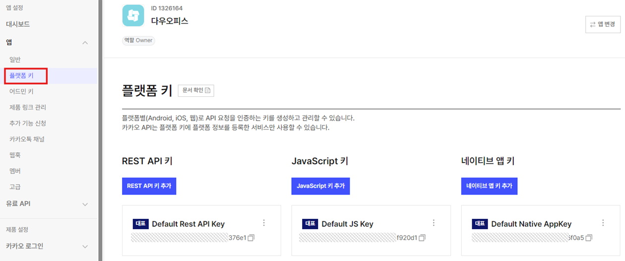 1. 왼쪽 메뉴에서 [앱] > [플랫폼 키] 선택