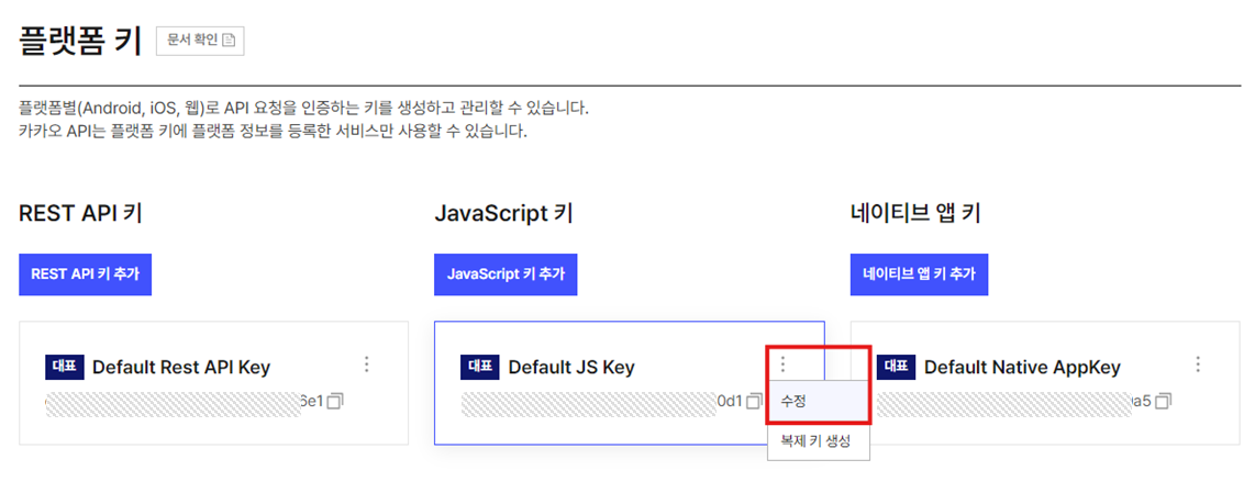 3. [JavaScript 키] 영역의 우측 상단 더보기 아이콘을 클릭한 후, [수정] 선택