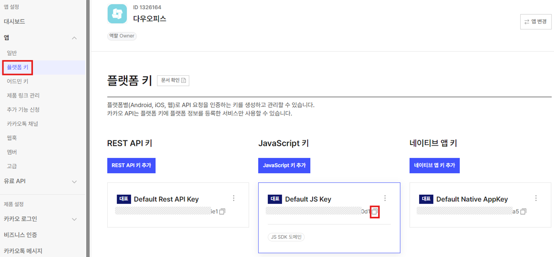 2. 앱 키 목록 중 [JavaScript 키] 옆의 복사 아이콘을 클릭