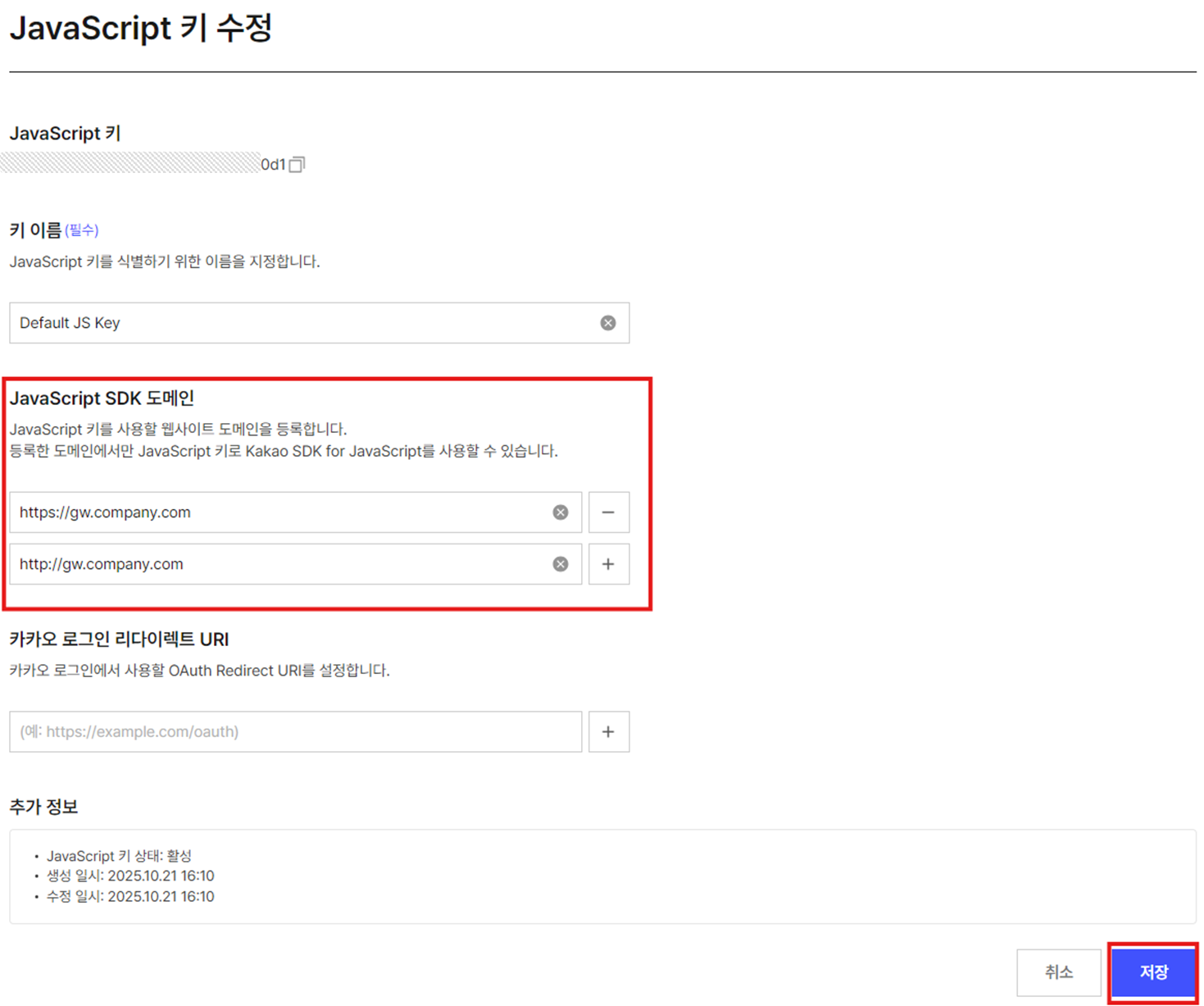 3. 팝업창 입력란에 복사한 JavaScript 키를 붙여넣고 [저장] 클릭