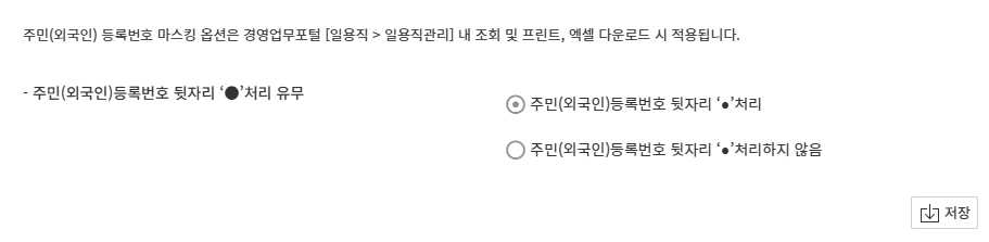 해당 설정을 통해 🧭경영업무 포털 > 급여 관리 > 일용직 > [일용직관리] 내의 일용근로자 주민등록번호 뒷자리를 마스킹 처리 할 수 있습니다. 자세한 내용은 📑[일용직] 일용직관리 가이드 를 참고 하세요