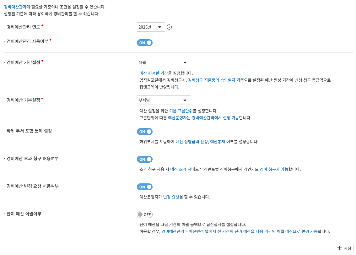 경비예산관리 사용여부 : 경비예산관리 기능 사용 여부 선택