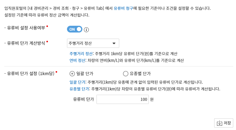- 유류비 단가 계산방식 : 유류비 단가를 계산할 방식 설정 가능 (주행거리 정산/연비 정산)