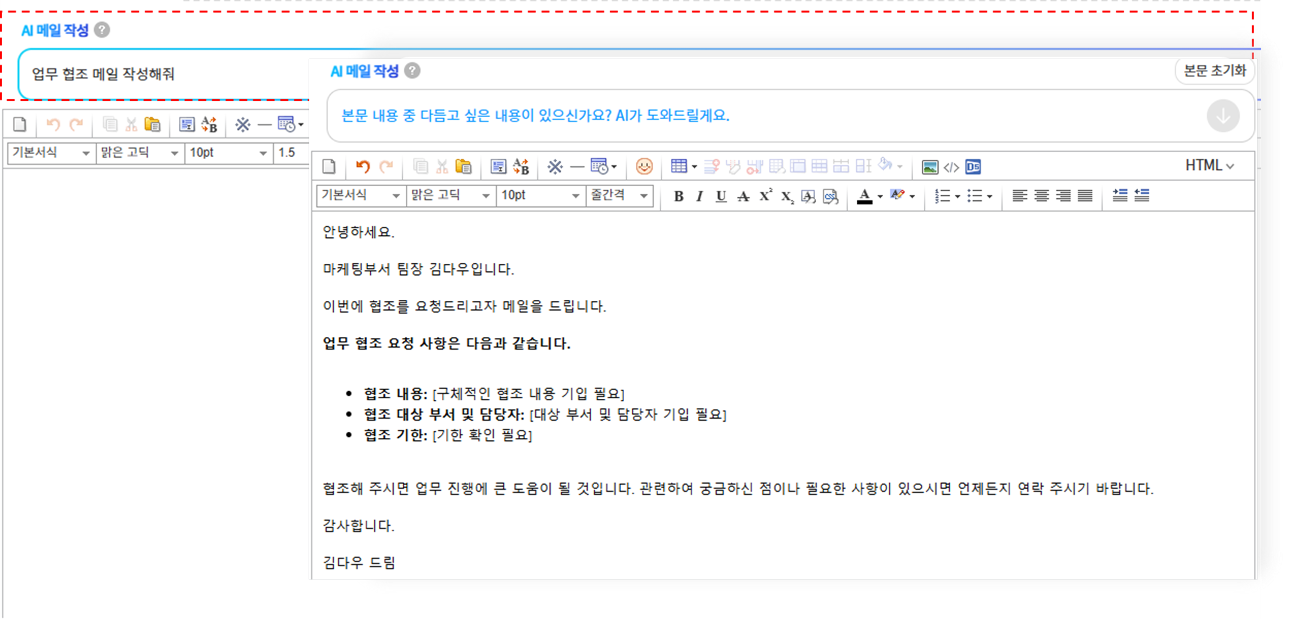 생성된 메일에 추가로 수정하고 싶은 내용이 있다면, AI에 다시 요청하면 이어서 반영됩니다.