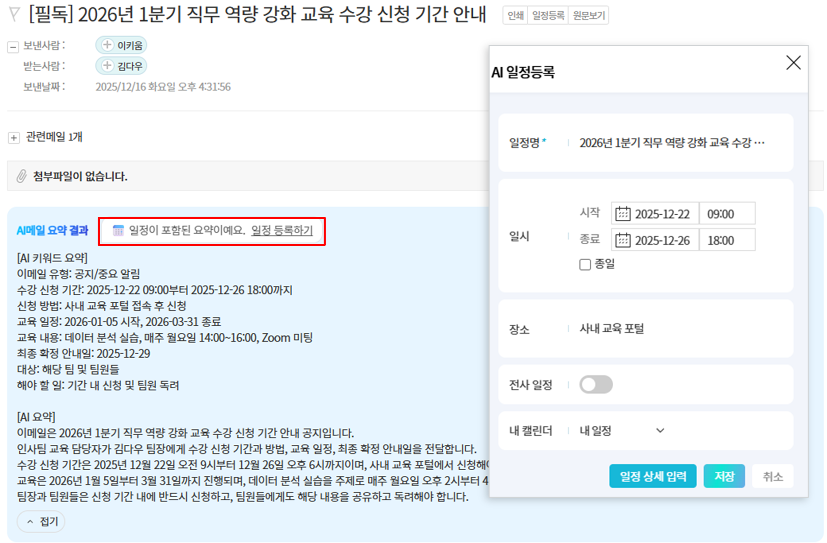 AI가 메일 내용을 분석해 일정명, 일시, 장소 등 핵심 정보를 자동으로 입력합니다. 필요한 부분을 수정한 후 [저장] 버튼을 클릭하면 다우오피스 캘린더에 일정이 등록됩니다.