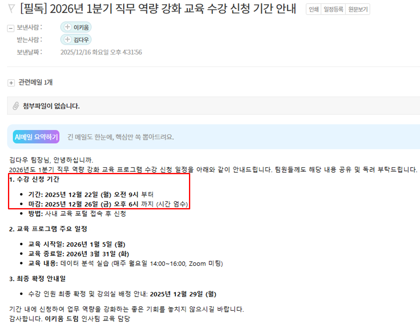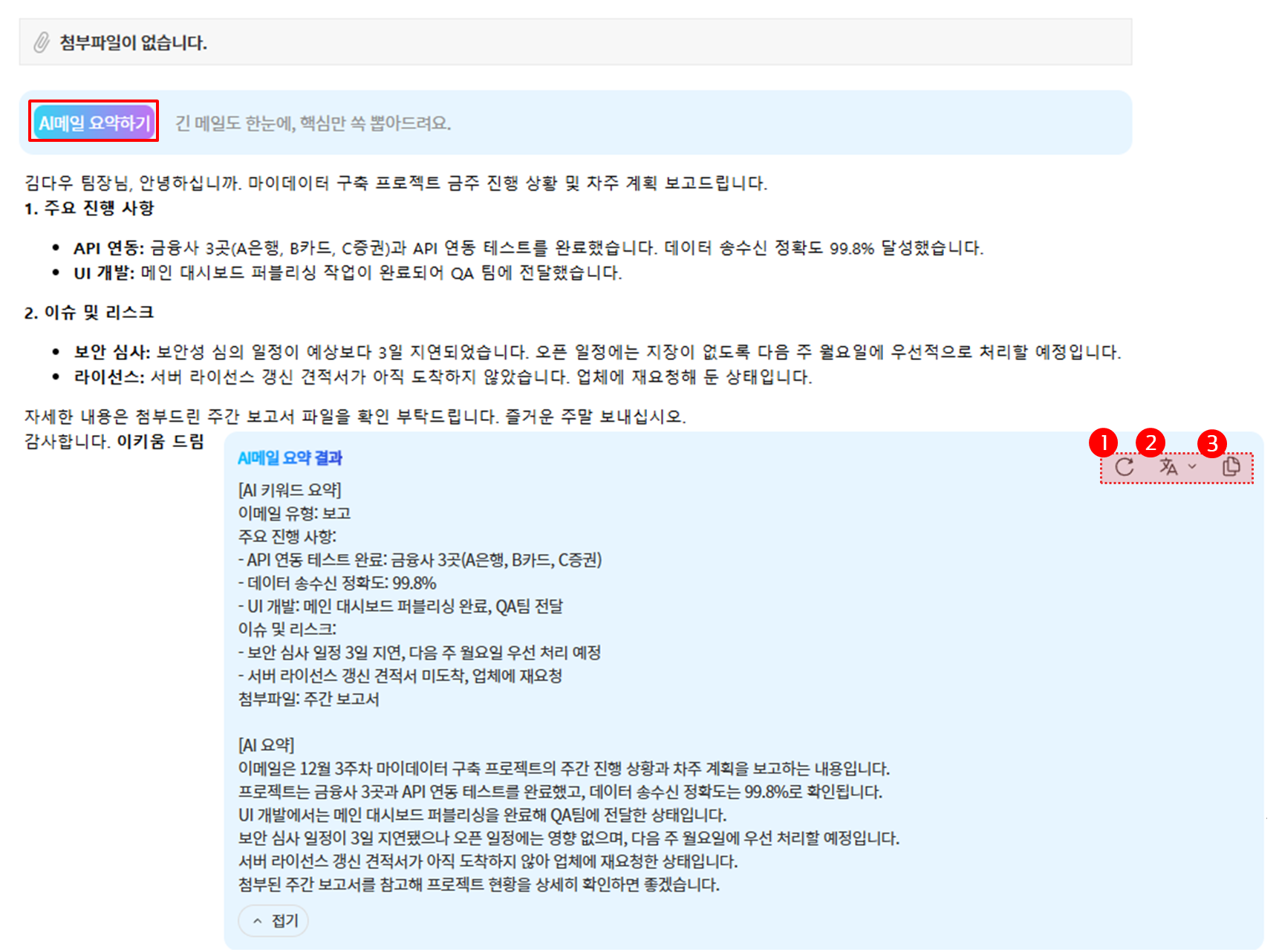 메일 읽기 화면에서 [AI메일 요약하기] 버튼을 클릭하면 메일 내용을 요약할 수 있습니다.