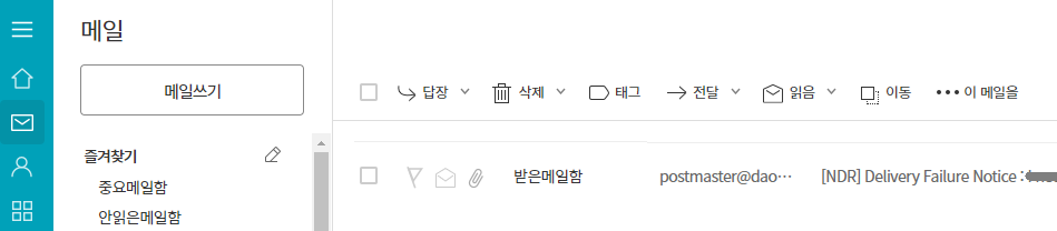 메일 발송에 실패한 경우, "[NDR] Delivery Failure Notice : ###" 와 같은 제목의 메일이 도착합니다.