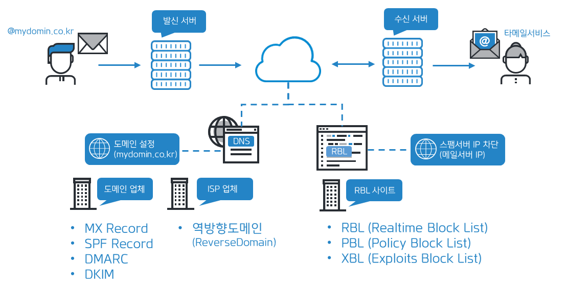 메일을 보낼 때 스팸으로 차단되지 않기 위해서는 우리가 메일을 보내는 서버와 보내는 메일이