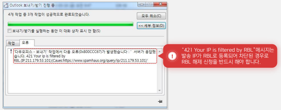 내 메일이 RBL에 등록되어 발생하는 아웃룩 오류 예시 화면