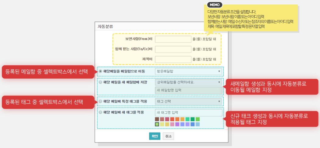 1. 처리상태별 메일함 생성 2. 자동분류, 태그 적용 |