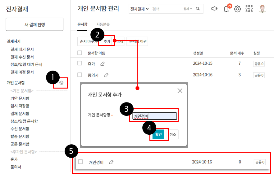 개인 문서함 설정에서 추가 개인 문서함을 생성/삭제 하거나 순서 변경/이관/공유를 할 수 있습니다.