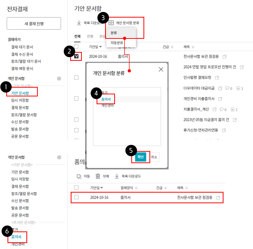 기안, 결재, 참조/열람, 수신 문서함, 임시 저장함의 모든 문서는 조회 후 추가로 생성한 개인 문서함에 수동/자동으로 분류할 수 있습니다.