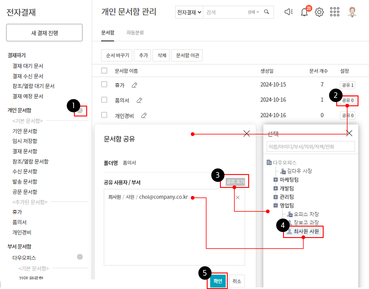 추가로 생성한 문서함은 개인 또는 부서에 공유할 수 있고, 공유받은 개인/부서는 해당 문서함을 함께 확인할 수 있습니다.