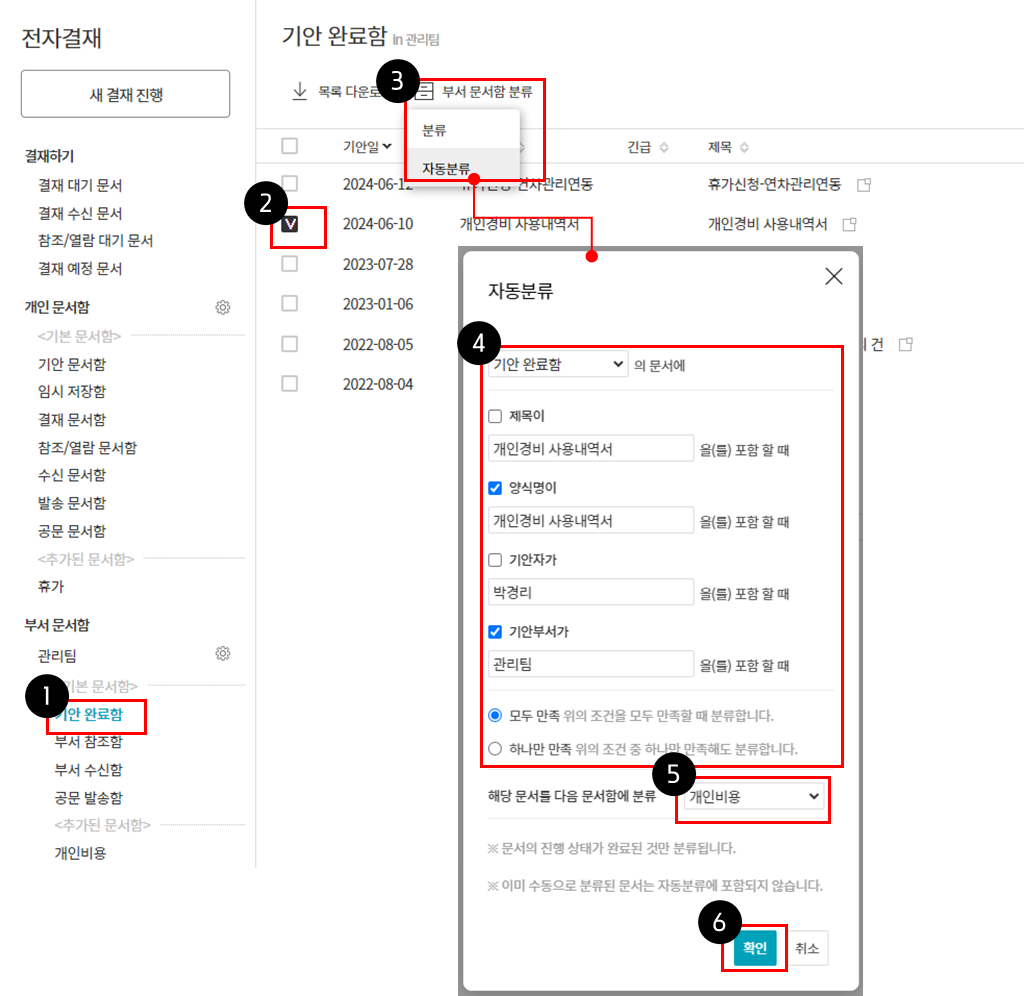 자동분류 조건을 설정하면 이후에 결재가 완료된 문서부터 자동으로 분류됩니다.