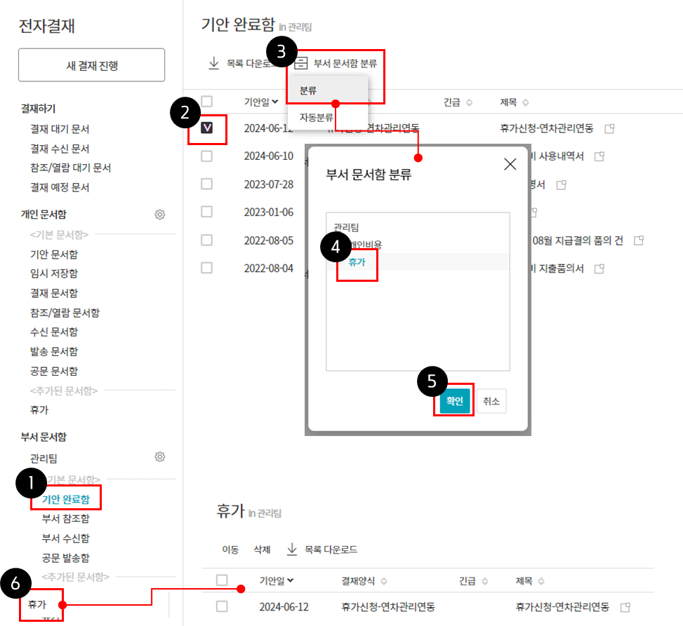 6. 추가된 문서함 클릭 > 분류한 결재 문서 확인 가능