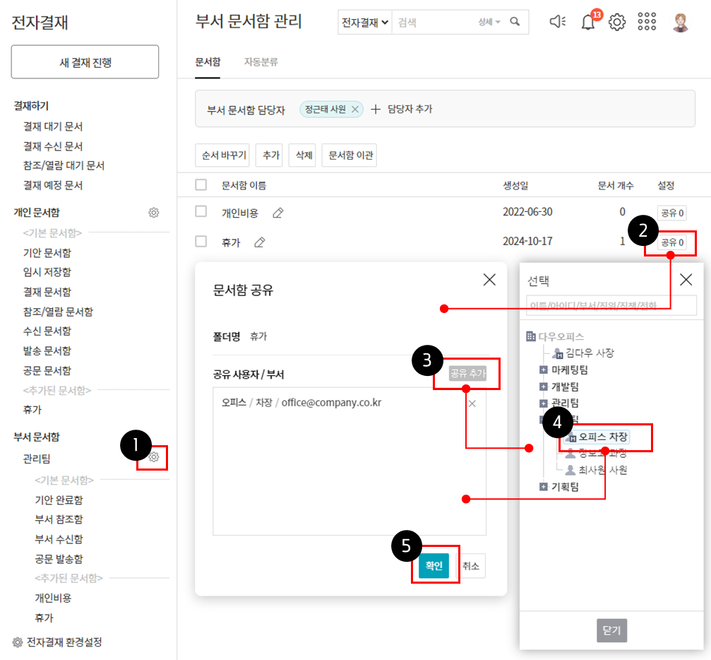 추가로 생성한 문서함은 개인 또는 부서에 공유할 수 있고, 공유받은 개인/부서는 해당 문서함을 함께 확인할 수 있습니다.